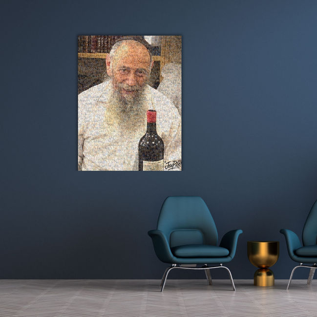Ce tableau mosaïque du Rav Avraham Mimoun de Marseille met en lumière la personnalité chaleureuse et inspirante de ce maître respecté. Construit à partir de centaines de petites photos soigneusement sélectionnées, il compose un portrait unique où chaque détail prend vie. Le Rav apparaît ici avec un sourire bienveillant, entouré de symboles de partage et de convivialité, ce qui confère à l’œuvre une dimension à la fois spirituelle et humaine.